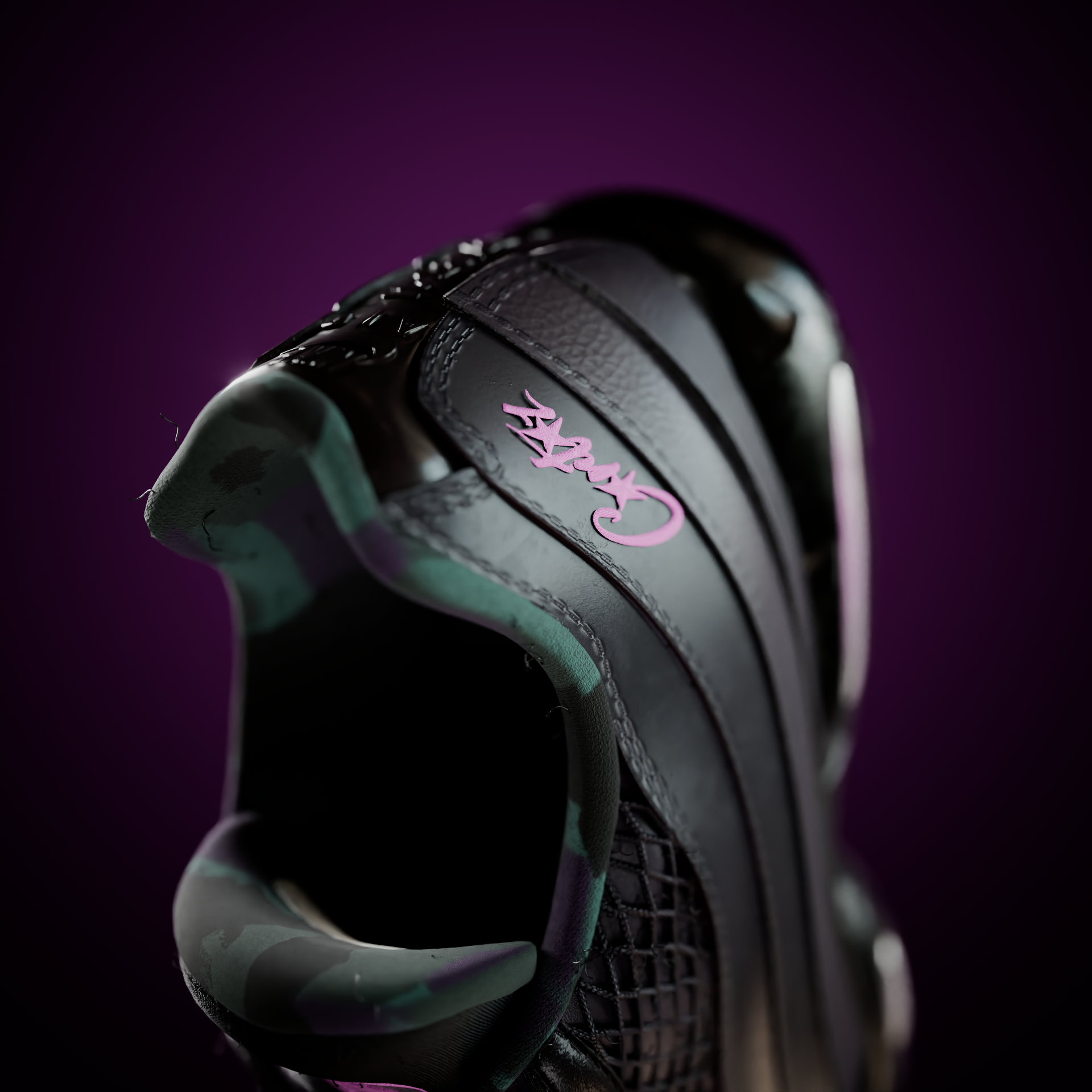 The shoe was sourced from CG Trader and setup in C4D. However, the shoe only came with the green colour scheme so adjustments were made to the original texture files in order to create the pink and navy colouways.